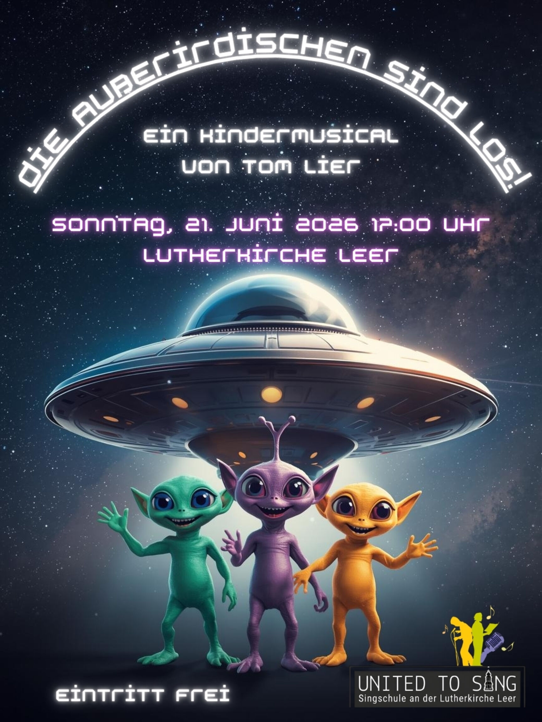 Das Musical "Die Außerirdischen sind los" von Tom Lier wird am 21. Juni um 17 Uhr in der Lutherkirche in Leer zu sehen und zu hören sein. Die Kinder unserer Singschule zeigen einmal mehr, was sie können! Begleitet werden sie dabei von einer profesionellen Instrumentalcombo.