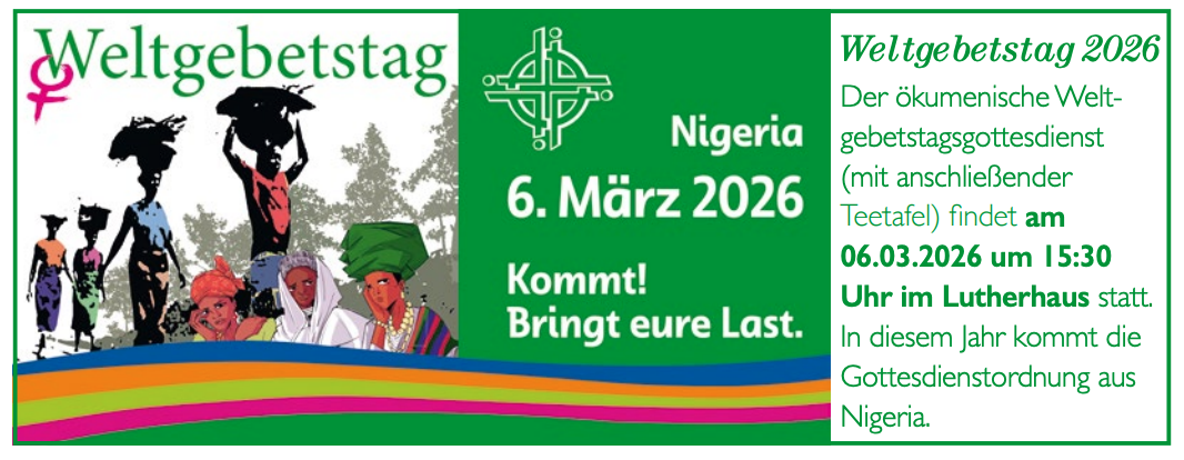 Herzliche Einladung! Der ökumenische Weltgebetstagsgottesdienst (mit anschließender Teetafel) findet am 06.03.2026 um 15:30 Uhr im Lutherhaus statt. In diesem Jahr kommt die Gottesdienstordnung aus Nigeria.