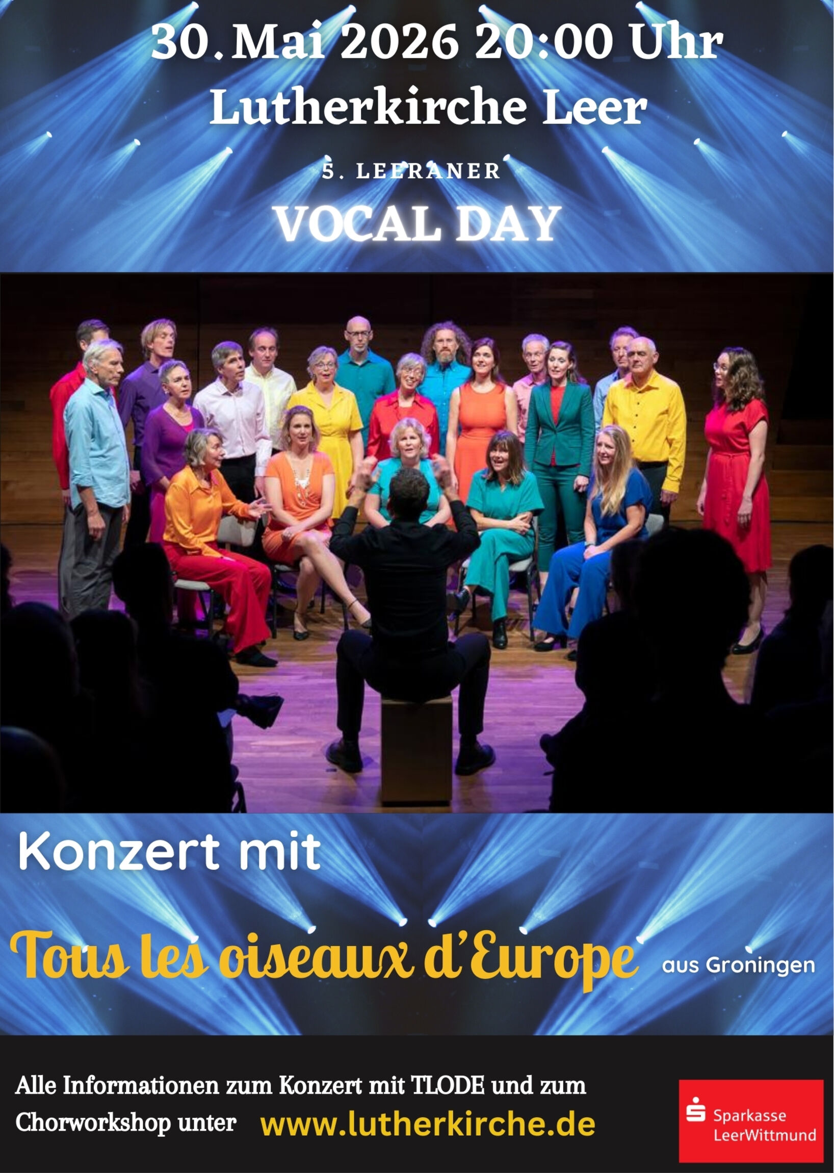 Hans Kaldeway und TLODE werden am 30.5. einen ganztägigen Workshop im Lutherhaus Leer (Patersgang 4) leiten. Von ca. 11-17.30 Uhr werden wir neue Musik kennenlernen, mit dem Körper und der Stimme arbeiten und vor allem viel Spaß zusammen haben. Der diesjährige Workshop steht unter dem Motto „Start of Creation, Part of Creation“ und hat einen besonderen Schwerpunkt in der Chorimprovisation. Mittags gibt es spanische Leckereien vom Restaurant Picofino, abends hören wir das Konzert von TLODE. Außerdem werden wir am Sonntag, den 31. Mai um 10 Uhr im Gottesdienst in der Lutherkirche gemeinsam mit Hans Kaldeway und TLODE Ergebnisse unseres Workshops zu Gehör bringen! Der Workshop ist begrenzt auf 150 TeilnehmerInnen; Vorkenntnisse sind nicht erforderlich.